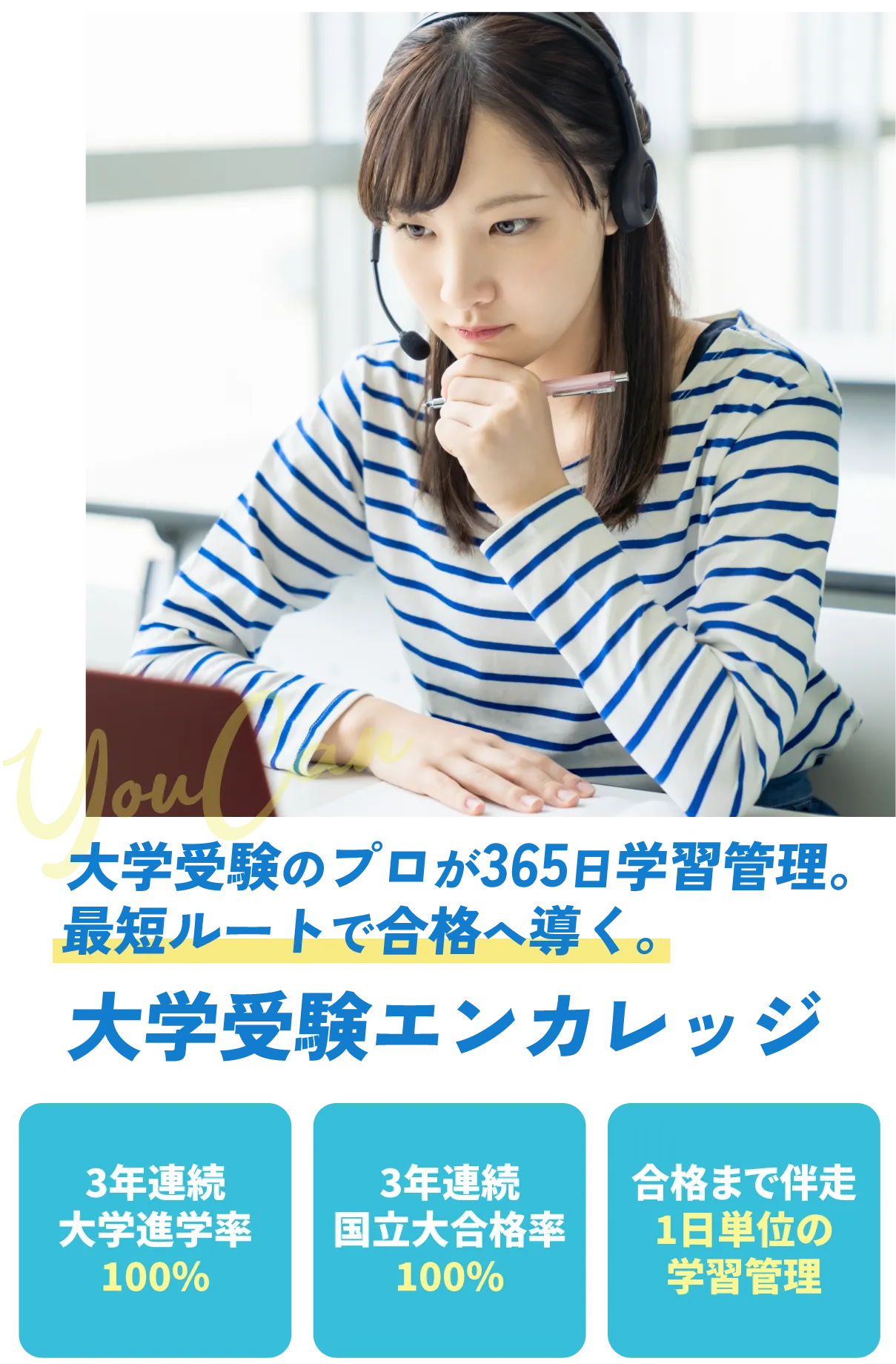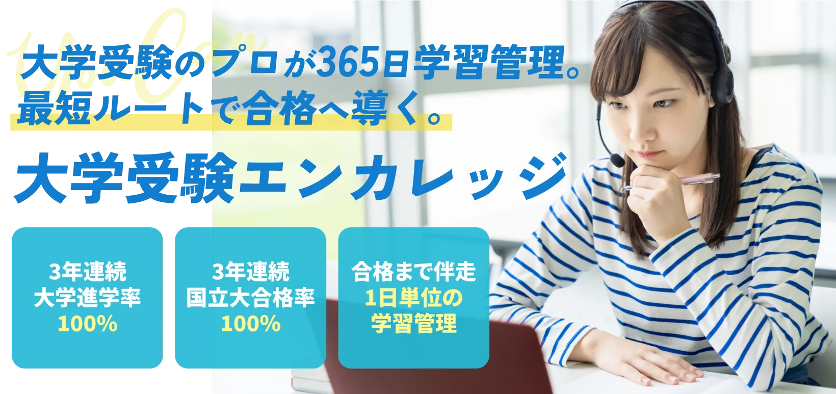 大学受験エンカレッジでは、志望校に特化した1日単位の学習計画を作成します。週1回の学習管理面談や科目別の個別指導を通して、志望校合格まで学力を伸ばします。