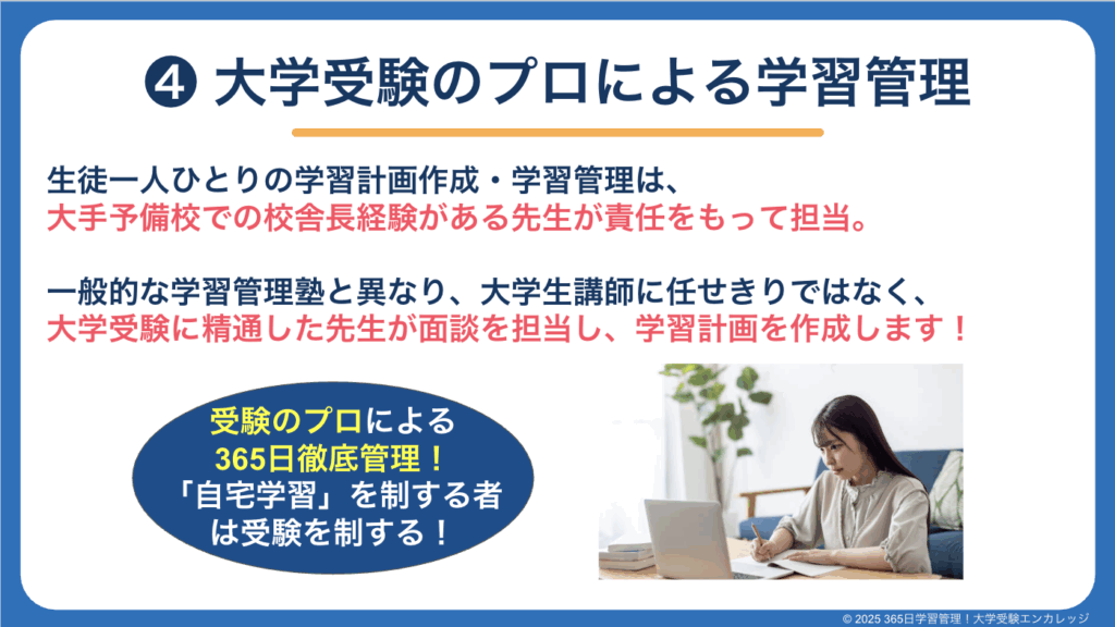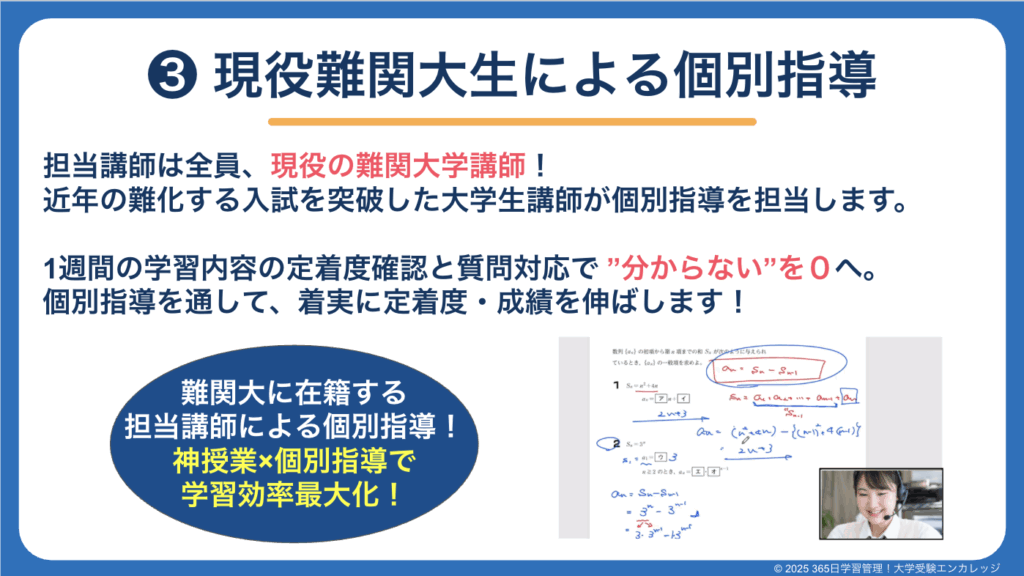 大学受験エンカレッジでは、毎週の学習管理面談や個別指導で生徒1人ひとりの受験勉強に全力伴走!
