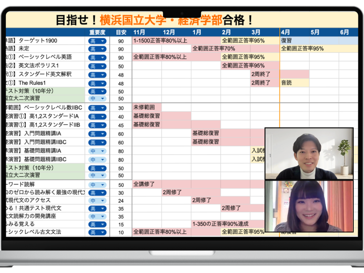 現在の学力・志望校・残り時間をもとに、代表自らが一人ひとりの「合格から逆算したカリキュラム」を作成します。学習計画は、志望校レベルに合わせて「映像授業+参考書」の組み合わせを完全カスタマイズしているため、無駄な勉強は一切なし。