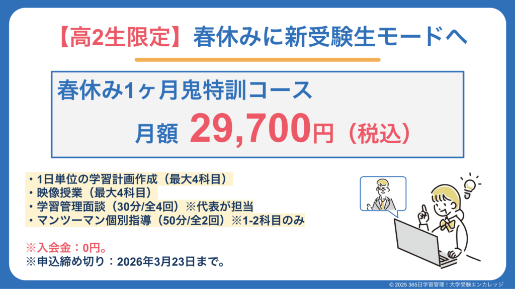 【高2生(新高3生)限定】春休み1ヶ月鬼特訓コース(入会金不要)